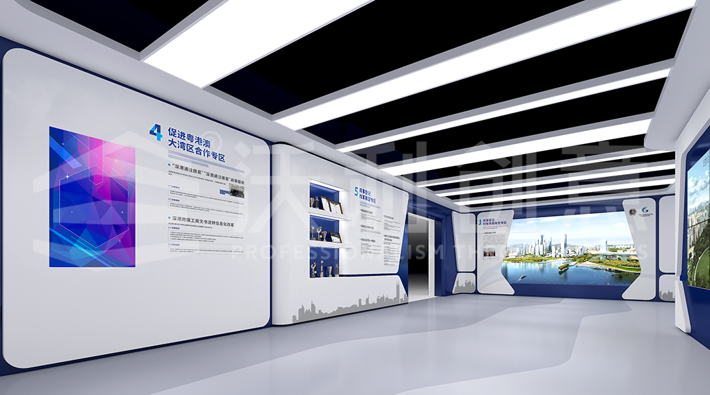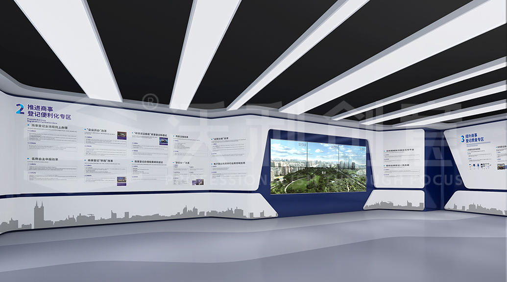 前海蛇口自貿(mào)片區(qū)制度創(chuàng)新展示廳結(jié)合前海蛇口自貿(mào)片區(qū)的創(chuàng)新精神,融入企業(yè)標(biāo)識(shí)的科技藍(lán)元素,打造極具現(xiàn)代感和開放性的展廳。展墻與多媒體展項(xiàng)協(xié)調(diào)統(tǒng)一,五大內(nèi)容展區(qū)劃分清晰,讓制度創(chuàng)新成果一一呈現(xiàn)。