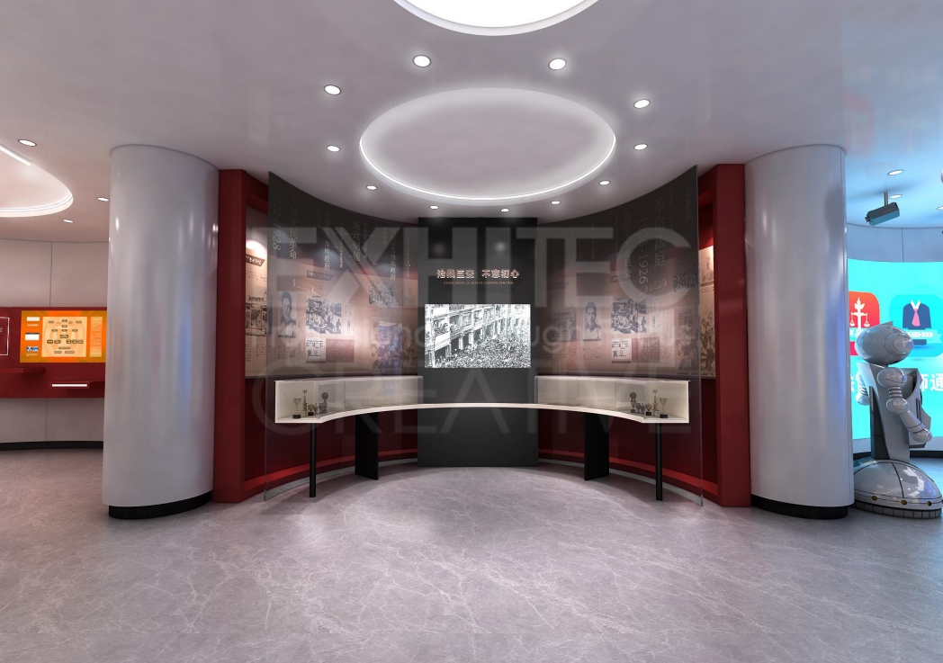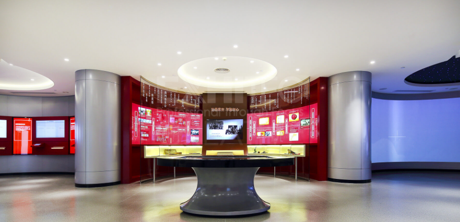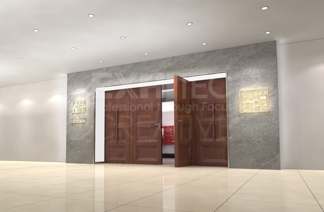 黑白灰為主體+故宮紅點(diǎn)綴貫穿整個(gè)空間設(shè)計(jì),黑白灰與原木色搭配打造廣東法院展覽館雅致簡潔與獨(dú)到,配合石材地面降低司法內(nèi)容凝重感營造既有科技智慧又有視覺層次設(shè)計(jì)氛圍。