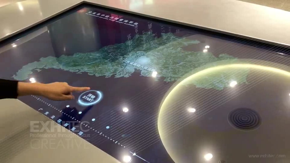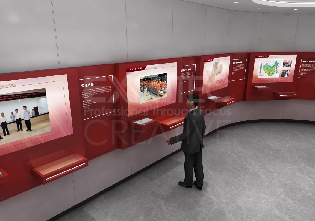 通過觸控查詢屏展示廣東省各基層法院歷史沿革及重大案例,通過炫麗的沙盤動畫指引,觀眾可通過點(diǎn)擊地圖,直觀地查詢24個(gè)基層法院的詳細(xì)內(nèi)容。