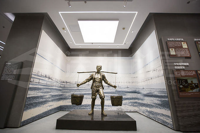 我們在展館內(nèi)設(shè)計了“搏浪前行”主題浮雕,以生動的場景還原表現(xiàn)如東人披荊斬棘、勇挑重?fù)?dān)的奮斗精神。