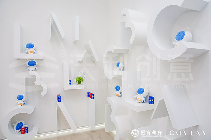 展廳在展示先進(jìn)的金融科技技術(shù)同時,也不忘傳遞有溫度的品牌與文化,在以 CMB LAB 的logo為靈感而設(shè)計的立體展架上,裝點著小招喵周邊文化產(chǎn)品,可愛萌趣的小招喵帶著大家的美好祝愿,向來訪者展示招商銀行金融科技文化與品牌的情感溫度。
