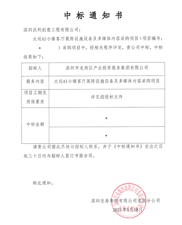 日前,沃利創(chuàng)意成功中標(biāo)深圳市龍崗區(qū)大運(yùn)AI小鎮(zhèn)客廳展陳設(shè)施設(shè)備及多媒體內(nèi)容采購(gòu)項(xiàng)目!