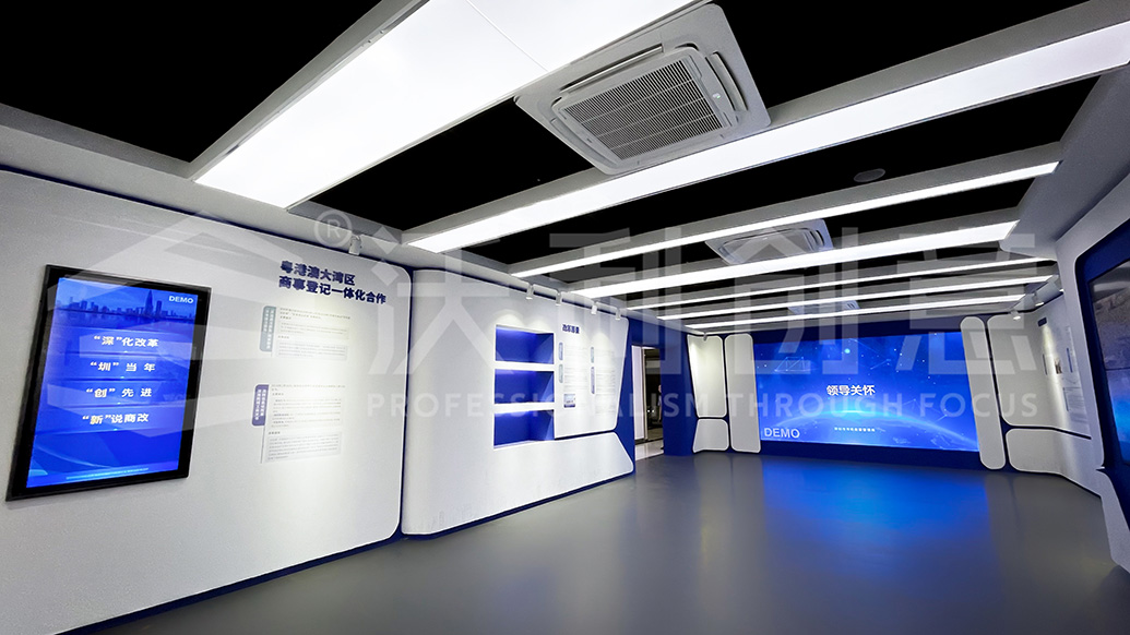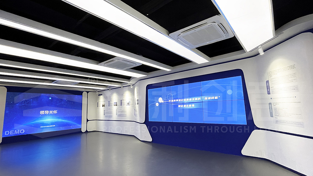 作為中國自貿(mào)試驗(yàn)區(qū)的“頭雁”, 深圳前海蛇口自貿(mào)片區(qū)始終保持著強(qiáng)勁的發(fā)展勢頭,以扎實(shí)的經(jīng)濟(jì)基礎(chǔ)、完善的產(chǎn)業(yè)體系及改革創(chuàng)新精神,引領(lǐng)著制度創(chuàng)新的方向。沃利創(chuàng)意結(jié)合前海蛇口自貿(mào)片區(qū)的創(chuàng)新精神,融入企業(yè)標(biāo)識的科技藍(lán)元素,打造極具現(xiàn)代感和開放性的展廳。展墻與多媒體展項(xiàng)協(xié)調(diào)統(tǒng)一,五大內(nèi)容展區(qū)劃分清晰,讓制度創(chuàng)新成果一一呈現(xiàn)。