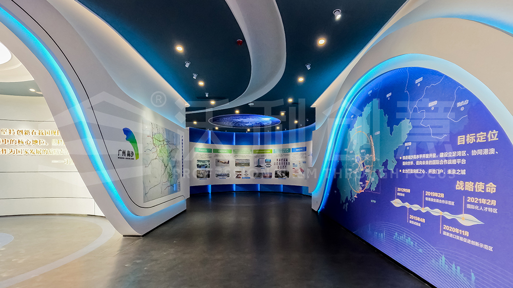 創(chuàng)新設(shè)計(jì)的流線型空間形態(tài)將展廳自然切分成不同區(qū)域,整體風(fēng)格開闊、大氣,充滿未來感與科技感。多媒體展項(xiàng)與內(nèi)容融合,用視覺創(chuàng)意呈現(xiàn)慶盛樞紐片區(qū)積極塑造國際創(chuàng)新城,努力打造粵港澳大灣區(qū)重要科技創(chuàng)新節(jié)點(diǎn)的規(guī)劃及實(shí)踐。