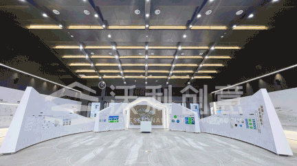 展廳保留了原建筑高挑通透,開闊正方的空間特點(diǎn),展廳采用中軸對稱式設(shè)計(jì)思路,與建筑結(jié)構(gòu)交相呼應(yīng),和諧融入空間。